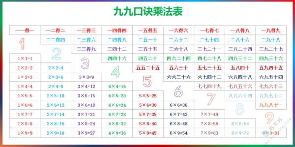 这是一张不一样的九九乘法表,它是多彩矩阵型的,逼格高,可能很多人都没有见过。家里孩子上小学了,要开始学习乘法了,没有一张像样的九九乘法口诀表怎么能行呢?没有一张特别高逼格的乘法表怎么能行呢?当然也可以去买一张,反正都很便宜,不过还是网上下载打印快一些,下面给大家提供的这份优雅的99乘法口诀表是非常高清的,多彩色可打印版一张a4纸即可打印,非常方便。